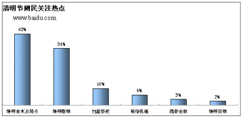 報告提供了一個有意思的結(jié)論,據(jù)百度網(wǎng)頁搜索數(shù)據(jù)顯示,在與2008年清明有關(guān)的所有關(guān)鍵詞中,網(wǎng)民最熱衷搜索清明的由來或介紹,比例高達(dá)43%。分析認(rèn)為,這反映了網(wǎng)民借助清明“充電“的強(qiáng)烈意愿,也體現(xiàn)了網(wǎng)民對傳統(tǒng)節(jié)日的重視。