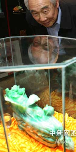 圖為重達(dá)12公斤色澤艷綠價值連城的“翡翠蟈蟈白菜”引人注目。 作 者:曲連遵