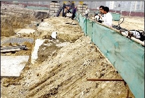 事發(fā)時,該工地正在進行地基部分施工,在地基槽東側和南側2米多深的地方挖出大量三合土和青石磚。文保人員介紹,這些都是比較典型的明清時期墓葬標識,初步勘察墓葬有10米見方,深3米多。在工地內(nèi)施工的工人稱,數(shù)天前該工地中心位置也曾挖出過兩具棺木,并且出土過一塊方形的青石板。文保人員懷疑可能是一塊墓志銘,但由于施工破壞,找到青石板比較困難。
