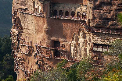 麥積山數(shù)百個(gè)石龕中,薈萃著上迄后秦下至清朝的十多個(gè)朝代的各種塑像。