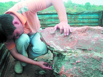 文物工作者在查看藏有疑似恐龍化石的石頭。李春璞 攝