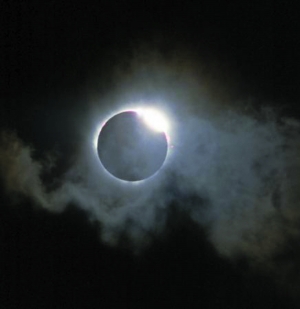 其次是日冕,當(dāng)貝利珠消失,月亮把太陽(yáng)安全擋住,立即可以在黑太陽(yáng)圓面的邊緣看到了一圈紅色的色球?qū),有時(shí)還能看到從色球?qū)訃姲l(fā)出的白色日珥;隨即色球?qū)右脖辉铝琳谧。綍r(shí)看不到的太陽(yáng)外層大氣———日冕就露出了“尊容”,它那呈現(xiàn)放射開(kāi)頭的珍珠色光芒,好像給太陽(yáng)戴上了一頂帽子。此時(shí),在黑暗的天空中,往往還能看到金星和木星等行星,以及其他明亮的恒星。