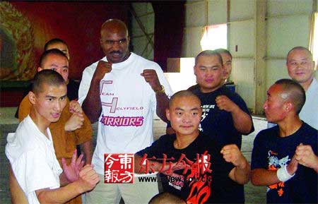昨天上午9點(diǎn)半,曾經(jīng)4次戴上拳王金腰帶、在與泰森比賽時被后者咬掉右邊耳朵的美國拳王霍利菲爾德慕名來到少林寺,不僅一睹少林真功夫,還向少林寺方丈討教了不少練功的方法。
