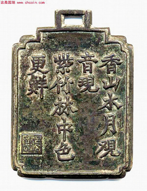 “香山水月觀音現(xiàn),紫竹林中色更鮮!弊蛉,一塊刻有無名詩句的清代古銅牌現(xiàn)身渝北區(qū)。對此牌,收藏界有兩種說法。一說,此牌是“名妓號牌”;二說,是當時某地下組織的“會員證”。