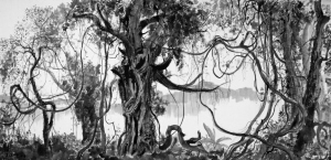 觸動吳冠中創(chuàng)作此畫的是蘇州郊外司徒廟的四株漢柏。它們曾遭雷劈,后又復(fù)蘇,從斷干折枝中再發(fā)新芽,于是再生枝藤。乾隆皇帝曾以“清”、“奇”、“古”、“怪”分別命名。