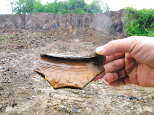 聞?dòng)嵹s來的南京市博物館考古隊(duì)員在挖塌的斷壁泥土中隨便撥弄,就找到幾塊碎陶片!澳憧,這塊是黑陶、這塊是夾砂紅陶,從陶片看,這個(gè)器皿不小,上面還有不是很規(guī)則的戳印紋!庇浾咦屑(xì)一看,上面刻的紋飾非常精美。一位考古專家說,此次經(jīng)過考古勘探,郭家山坑商周時(shí)期古文化遺址長(zhǎng)220米,寬120米左右,面積達(dá)到2.3萬平方米。從斷面上可見大量紅燒土層及紅陶、灰陶片,其中可辨器有罐、鬲、鼎等。據(jù)悉,考古人員在這個(gè)文化遺址上一共探測(cè)到了8個(gè)文化層,最底層則是3000多年前的商周文化層。