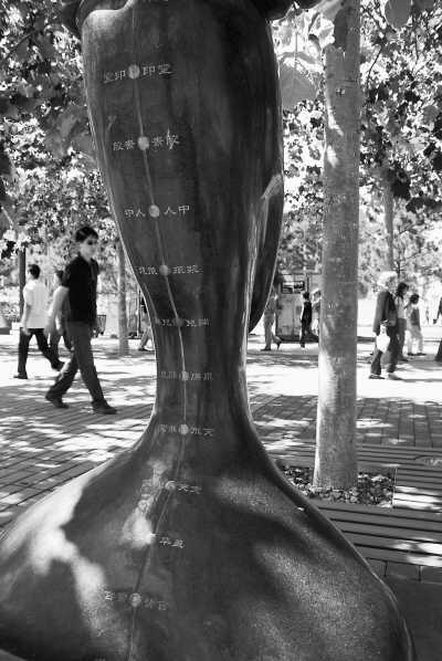 北京街頭的藝術(shù)雕塑,標示著人體的主要穴位。