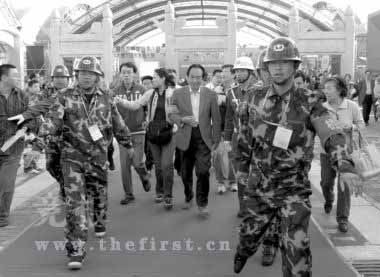 講座全部結(jié)束時(shí),為使閻崇年能穿過(guò)人群順利到達(dá)方澤壇北門(mén)的休息室,約有十幾名安保人員為其開(kāi)道,幾乎是“架”著閻崇年離開(kāi)會(huì)場(chǎng),不時(shí)有熱情的讀者欲遞過(guò)書(shū)簽名,但是卻完全不能接近。