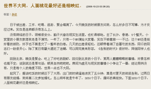 在這篇博文的最后一段,徐靜蕾如是寫(xiě)道:“起風(fēng)了,據(jù)說(shuō)吃飯的時(shí)候還下了大雨,出門(mén)的時(shí)候猛地涼爽了五分鐘,算是對(duì)夏天的徹底告別。過(guò)兩日有朋友結(jié)婚,我將第二次參加婚禮。怎么明年就是牛年了,3650個(gè)日子,循環(huán)的真挺快。下面3650個(gè)日子,人面桃花最好還是相映紅!