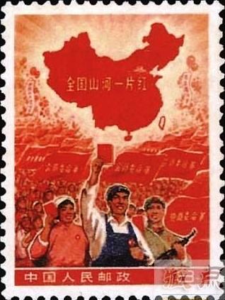 1968年9月“文化大革命”期間,全國除臺灣省外29個省、直轄市、自治區(qū)均成立了革命委員會。為紀(jì)念和慶祝這一事件,郵電部決定于1968年11月25日發(fā)行1枚“全國山河一片紅”郵票。面值8分。郵票圖案為工農(nóng)兵手持《毛主席語錄》,背景中“革命委員會”的紅旗匯成的紅色海洋和工農(nóng)兵群眾熱烈歡呼的場面,上方為一幅中華人民共和國地圖,地圖上除臺灣省外全部繪成大紅色,上面印有“全國山河一片紅”金字,郵票票幅為30毫米×40毫米,齒孔11.5度×11度,整張枚數(shù)50(10×5)。影寫版。北京郵票廠印制。集郵者稱為“一片紅”。