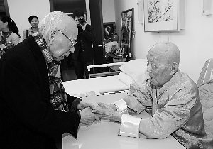 昨天下午,著名學(xué)者、漢學(xué)大師饒宗頤專程來到解放軍總醫(yī)院,看望北大資深教授季羨林。饒先生送上題字“松高唯岳”,祝愿季老身體健康。98歲高齡的季羨林與92歲高齡的饒宗頤在學(xué)界被尊稱為“南饒北季”,兩人同為當(dāng)今學(xué)界泰斗。