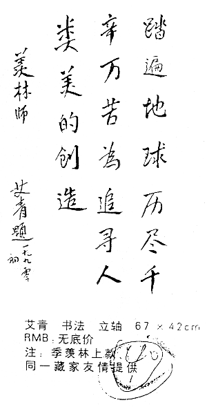 昨日,艾青妻子看到“金兆拍賣圖錄”復(fù)印件中艾青的書法作品后告訴本報(bào),這幅作品可以百分之百肯定為假的,“從哪方面來(lái)說(shuō)都是假的,艾青和季羨林沒什么交往,從字跡來(lái)說(shuō)是假的,從年代上來(lái)說(shuō)也不可能!