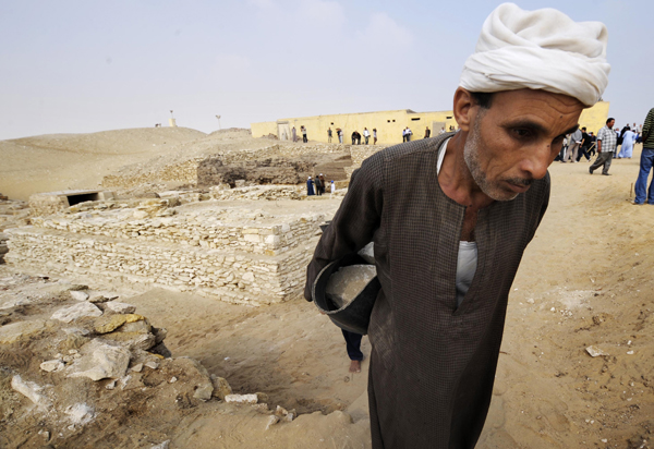 11月11日,一名工作人員在新發(fā)現(xiàn)的金字塔周圍搬運(yùn)碎石。