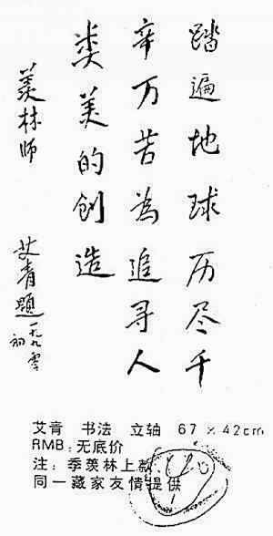 艾青妻子在看到復印件中艾青的書法作品后對北京媒體表示,這幅作品可100%肯定為假的:“從哪方面來說都是假的,艾青和季羨林沒什么交往,從字跡來說是假的,從年代上來說也不可能!卑鄡鹤影ひ舱J為,艾青比季羨林年長,不可能稱季羨林為“羨林師”。