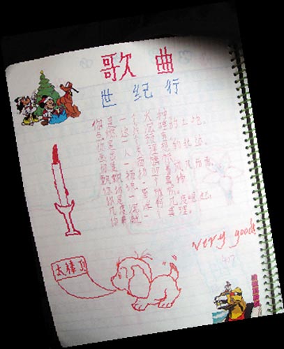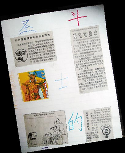 黃曉明被曝光的不是作文,而是初一時(shí)候的摘抄本,現(xiàn)在看來(lái),這些摘抄本相當(dāng)幼稚,封面上畫(huà)了朵很大的花,旁邊是黃大帥哥當(dāng)年的稚氣簽名:“初一(1)黃曉明”。在摘抄本的內(nèi)頁(yè)中,則是一些剪報(bào)和歌詞抄錄,其中的一頁(yè)剪報(bào)內(nèi)容是生活小竅門(mén)《如何使松懈的毛衣恢復(fù)彈性》、《鐵鍋不宜做酸食》、《居室寬敞法》、另一頁(yè)是《蘿卜的妙用》等同類剪報(bào),兩張剪報(bào)的空白處,都用彩筆寫(xiě)著“圣斗士”“米老鼠園地”等字樣,還有一頁(yè)則是歌曲《世紀(jì)行》的歌詞抄錄,在下方是“太棒了”、“Very good”等評(píng)語(yǔ)。