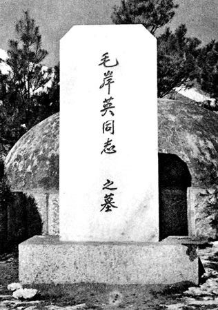 在朝鮮平安南道檜倉郡的“中國人民志愿軍烈士陵園”內(nèi),一塊一米高的花崗巖石矗立在墓前,正面刻著“毛岸英烈士之墓”;背面刻著:“毛岸英同志原籍湖南省湘潭縣韶山?jīng)_,是中國人民領(lǐng)袖毛澤東同志的長子。1950年11月25日在抗美援朝戰(zhàn)爭中英勇犧牲。毛岸英同志的愛國主義和國際主義精神將永遠(yuǎn)教育和鼓舞著青年一代。毛岸英烈士永垂不朽!”