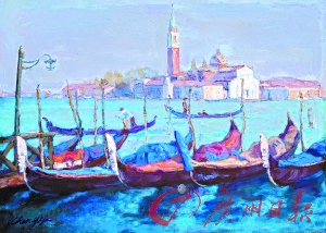 而陳逸飛的《威尼斯》以前從沒有拍賣過,是現(xiàn)在的擁有人1999年直接向畫家購買的。取景是威尼斯著名的大運河 ,前面泊著4艘運河木船 ,運河上另有兩艘木船,對岸是著名的圣馬可大教堂。朦朧的煙霞,叫人分不清是早晨還是黃昏。采用的意象表達手法是陳逸飛作品中極為罕有的。早在1990年,畫家曾繪過一幅同名的風(fēng)景畫。然而兩幅畫有很大的不同。1990年那一幅層次較分明,色彩也較濃烈,采用的是陳逸飛一貫的寫實手法。9年后的《威尼斯》用色較淡,景物的處理較隨意,很有印象派大師莫奈的影子。