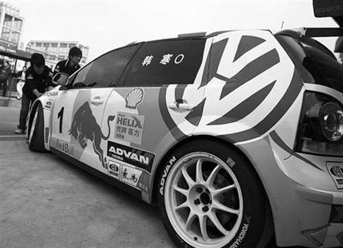 昨日中午1點多,記者趕到成都金港賽道,比賽還沒有開始,工作人員正在檢修各個選手的賽車。記者走進大眾333車隊的車庫,發(fā)現(xiàn)一輛賽車上寫了一個大大的“寒”字,記者轉(zhuǎn)到車的另一邊,果然,側(cè)面車窗上清楚地貼著“韓寒”兩個字。