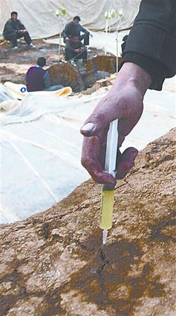 上圖:昨日,考古專家用特殊的藥水對熊家冢車馬坑邊的泥土進行加固。記者 周超 攝