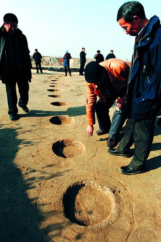 專(zhuān)家在仔細(xì)觀察類(lèi)似柱洞的遺址