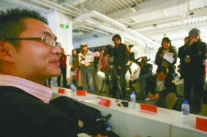 昨日,“山寨春晚”舉行媒體通氣會(huì),發(fā)起人老孟接受采訪。記者 孫純霞 攝