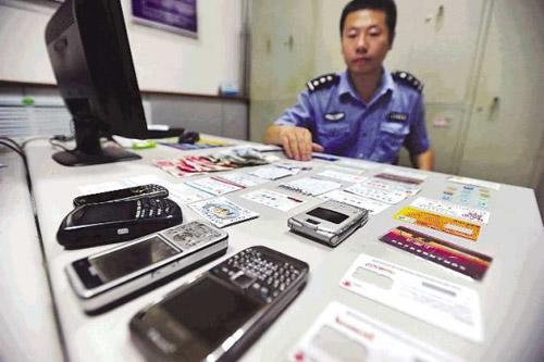 燕山派出所的民警正在整理犯罪嫌疑人的作案工具,有手機(jī)、各種手機(jī)卡、名片等。