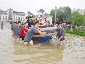 沖鋒舟把孩子們安全送出校門。高 峰 攝