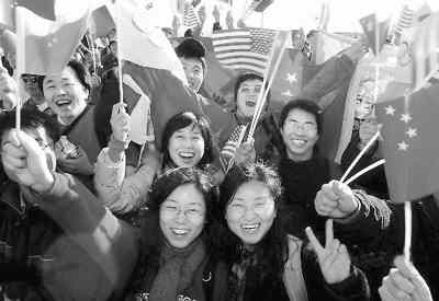 圖為北加州的中國留學(xué)生為奧運圣火傳遞搖旗吶喊。