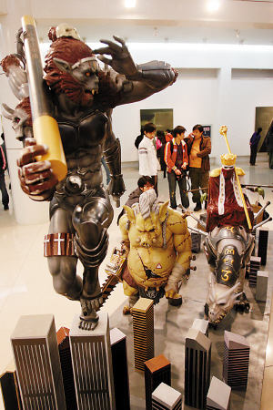 在展覽的最顯著位置,從川美畢業(yè)才兩年的“黃漂”王冕所做的雕塑作品“NEW YORK”引起了參觀者的格外關(guān)注,記者注意到,在這件作品中,唐僧的坐騎白龍馬加入了西方龍的造型,顯得有些面目可憎,而身上還貼滿了大眾、轟達等商標。唐僧也成了蒙面人,孫悟空長了四只手,豬八戒肥碩的手臂上蓋上了“驗訖肉檢”四個大字,而走在最后的沙僧擔子上挑的也不再是行李,變成了麥當勞和重慶百貨的購物袋,四人如此游紐約,想起來就讓人忍俊不禁。