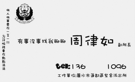 “有事沒事找我聊聊!睂W(xué)生周律如設(shè)計(jì)的名片上用活潑的美術(shù)大字寫了這么一句話,落款是自封的“周律如 副所長”!昂呛,副所長當(dāng)然只是假想,不過我覺得要多和群眾接觸,才能做好服務(wù)嘛,所以我就這么設(shè)計(jì)啦!”小周說。