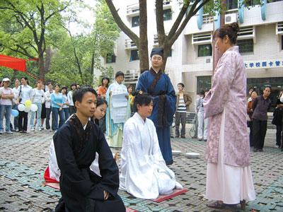 據介紹,受禮的帥自然和王曉紅兩人都是該校華夏傳統(tǒng)文化協會的成員。所有參禮人員都身著漢服,儀式莊重而又隆重,觀禮者達數百人。據悉,擔任本次成人禮正賓的是被學生們評為“重慶市魅力教師”的李達武教授,昨天他也專門穿上了漢服,并挽起了發(fā)髻,插上了漂亮的簪子來主持儀式。(記者 紀文伶 楊崢 通訊員 顏晶)