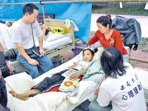李富洪老師介紹,他所在的心理援助隊(duì)5月17日從重慶出發(fā),當(dāng)天下午6點(diǎn)到達(dá)四川綿竹災(zāi)區(qū)。一下車(chē),就能聞到一股濃濃的刺鼻氣味,車(chē)站里稀稀拉拉幾個(gè)人,有的帶著口罩,有的神色沉重地急行而過(guò)。