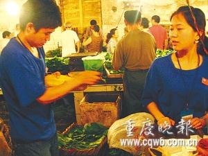 昨日早上七時至下午五時,來自重慶工商大學融智學院管理系大一的八名學生,和兩位在沙區(qū)土灣模范村農(nóng)貿(mào)市場賣菜的小販互換角色10小時,體驗彼此生活。