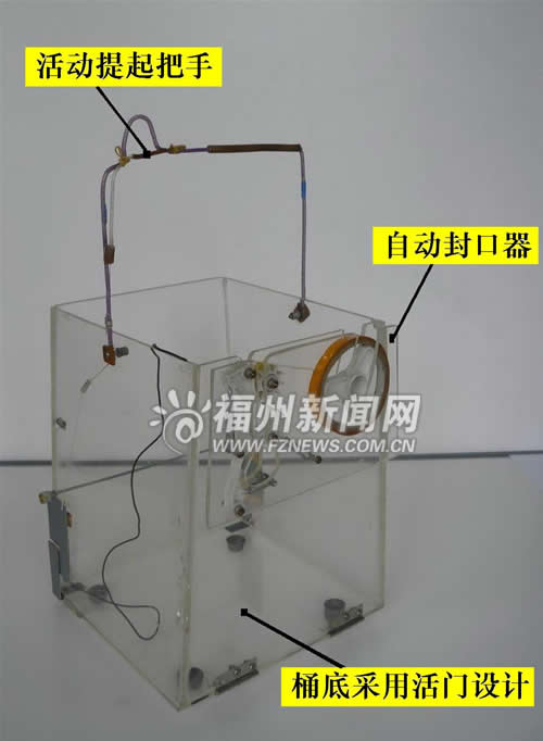 每次倒垃圾,都要先把垃圾從桶提出來,用手捆扎好后再丟棄。與垃圾的親密接觸以及垃圾袋的膨脹破裂,成了人們生活中難以避免的尷尬。福州教育學(xué)院的李昂同學(xué)發(fā)明了一種能自動封口,并從底部卸走垃圾袋的垃圾桶,巧妙地解決了倒垃圾的尷尬。