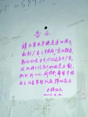 問起這張告示是何人張貼,住在樓里的居民告訴記者,有可能是住在樓里的一對(duì)老夫妻張貼的,他們特別熱心,經(jīng)常義務(wù)刷墻,八成是急了,寫成文字提醒那些小廣告印刻者注意,這也是無奈之舉啊!皠e看這幾層樓道現(xiàn)在白凈凈的,可過幾天再一看,馬上又變成了花花綠綠的大花臉了,看得人頭直發(fā)暈。”