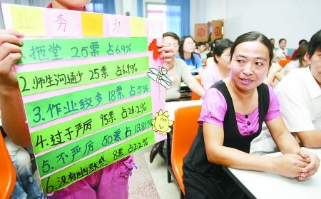 “學(xué)生的眼真毒!太嚴(yán)厲、拖堂、扔粉筆頭,好像我可以對(duì)號(hào)入座啦!”根據(jù)學(xué)生羅列的一堆毛病,一位女老師大吃一驚。“平時(shí),我真沒(méi)發(fā)現(xiàn)自己多厲害,現(xiàn)在聽(tīng)你們一說(shuō),真覺(jué)得有時(shí)不該發(fā)火!倍昙(jí)語(yǔ)文老師樊偉說(shuō)。
