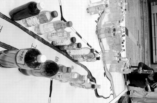 我們每天呼吸到的空氣,被裝進了藍色的氣球里,高高地飄在地圖的最上面。它代表著沈陽市的藍天。氣球下面用透明的繩子拴著幾十張照片。仔細一看,這些照片有渾河沿岸美麗的風(fēng)光、有夕陽、有綠樹,有老人垂釣、有兒童嬉戲,也有學(xué)生們拿著瓶子取水樣的場景。而在地圖的最下方,則是一張平面的手繪渾河、衛(wèi)工明渠等沈陽水質(zhì)圖。圖的上面擺放著大小不一的塑料瓶,瓶里裝著學(xué)生們采來的水樣。