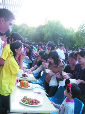現(xiàn)場(chǎng)烹飪比賽結(jié)束后,各參賽隊(duì)伍把自己的成品展示在一排長(zhǎng)長(zhǎng)的桌子上。現(xiàn)場(chǎng)學(xué)生排起了數(shù)十米長(zhǎng)的隊(duì)伍,人手一只碗,一雙筷,擺好陣勢(shì)沖著美食長(zhǎng)龍開始了“掃蕩”!捌呃镲h香”雞翅,“盛世金蘭”南瓜煲......各位學(xué)生大廚一邊介紹一邊拉票,場(chǎng)面熱鬧非凡。 (記者 薛冰 實(shí)習(xí)生 林珍 通訊員 何淑賢)