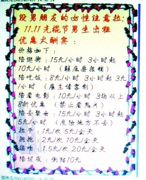 在這個特別的節(jié)日,更驚人的是,在各大高校BBS上,竟廣泛轉(zhuǎn)載著一條男生“出租”自己給女生一天的帖子,內(nèi)容包括陪逛街、吃飯、看電影及各種身體接觸的收費標準,服務時間長還可以打折。