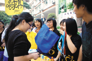 據(jù)了解,今年“搞搞新意思”的地方在于,老師也成為檔主,教導(dǎo)處5個(gè)老師注資一千多元開一個(gè)“雙飛翼”檔,所賣雞翅都是一位客家籍貫的老師以30幾元一包的價(jià)格從家鄉(xiāng)處買來(lái)的,而海報(bào)也是美術(shù)老師畫的。譚娟娟老師表示,所賺到的錢將捐給關(guān)工委幫扶小組和校內(nèi)有困難的同學(xué),“加入了慈善的因素,有不少學(xué)生并不是真的喜歡吃,是為了幫助人才來(lái)‘幫襯’,這體現(xiàn)了他們的愛心,而且老師跟學(xué)生一起參與,體現(xiàn)平等。