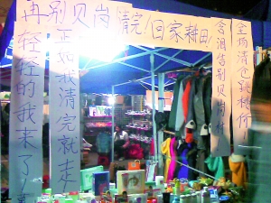 只見高高掛著的白色橫幅“再別貝崗,清完回家耕田”幾個(gè)字格外醒目,再加上“輕輕的我來(lái)了,正如我清完就走”、“含淚告別貝崗村,全場(chǎng)清倉(cāng)跳樓價(jià)”兩幅對(duì)聯(lián)。而“靈堂”下的“祭品”卻是各種名牌護(hù)膚品。對(duì)此,不少人學(xué)生表示很迷惑:“怎么是白色對(duì)聯(lián)呀,應(yīng)該用紅色才對(duì)吧?”隔壁攤位的老板極盡挖苦地說(shuō):“好像死了一家人,等著些錢買棺材似的!倍摗办`堂”的“堂主”,竟是來(lái)自華工的高才生,“因?yàn)闆]有機(jī)會(huì)外出去實(shí)習(xí),我們就通過(guò)這樣的方式來(lái)磨練自己。我們的樣子都這么慘了,大家一動(dòng)心就會(huì)買的!眱蓚(gè)男生強(qiáng)調(diào),做市場(chǎng)營(yíng)銷這一行,需要承受很多異樣的目光和心理壓力,這對(duì)他們來(lái)說(shuō)是極大的鍛煉。