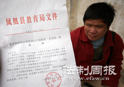 “根據(jù)有關精神,為規(guī)范學校管理,徹底終止學校聘任代課教師……必須在2007年12月28日之前讓代課教師走下講臺!崩闲iL含淚念出教育局文件的內(nèi)容,心如刀絞。