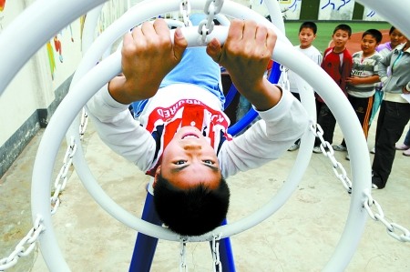 五年級的小學生徐成林排隊坐在一個名叫“過山環(huán)梯”的器材上,面朝上躺下,然后憑著手和腳的力量在環(huán)形的器材里,像只小蟲一樣蠕動前進。