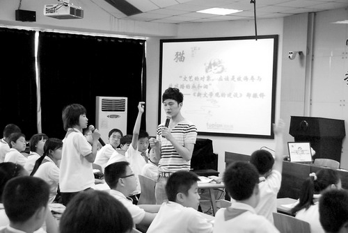 杭州建蘭中學(xué)的李明老師在語(yǔ)文課上與學(xué)生一起討論新文學(xué)觀。(資料照片)