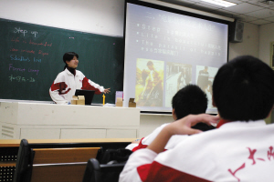 據(jù)了解,人大附中高中部開設的“主題電影欣賞”選修課,從組織到授課,都是由5名高中生全程承擔。這些熱愛電影、能力突出的高中生從暑假起便精心制訂教學計劃、寫教案、剪輯影片、做PPT。五名高中生的創(chuàng)舉贏得了選課同學的好奇和贊許。圖為一名學生在用幻燈講授電影欣賞知識。記者 羅德宏 實習生 王靜怡/文