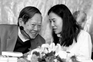 首發(fā)式上,楊振寧身著西服精神矍鑠,翁帆穿白色上衣溫婉大方。夫婦雙雙坐定面向讀者時,全場響起熱烈的掌聲。在隨后的活動中,翁帆除了充當(dāng)楊振寧的“耳朵”,偶爾為他重復(fù)讀者、媒體的問題外,倘若沒問到自己頭上,基本一言不發(fā),關(guān)注著楊振寧及其他嘉賓的講話。聽到楊振寧發(fā)表的觀點與見解后,時而點頭稱贊,時而頷首微笑。