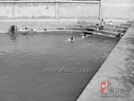 滇南武校內(nèi)有一個(gè)游泳池,但多年未用,泳池成了學(xué)生晾曬衣服的場地。游泳池的南側(cè)還有一池子,池內(nèi)的水就是從校外公路邊引來的龍?zhí)端3刈拥谋泵媸亲叩,地面高出水面約150厘米。池子的東、南、西3面都有臺(tái)階下到池底,學(xué)生們可以在這里洗衣服,當(dāng)然,練武的學(xué)生們也會(huì)在課后站到不深的池內(nèi)擦擦身子。