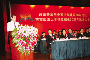 昨日,西南政法大學(xué)恢復(fù)招生30周年紀(jì)念大會(huì)召開,全國人大常委會(huì)副秘書長李連寧、國務(wù)院法制辦副主任張穹、最高人民法院副院長江必新、最高人民檢察院副檢察長朱孝清、中共重慶市委副書記張軒等出席論壇。幾位副部級以上高官盡管職務(wù)不同,但都喜歡把自己稱為西政人。