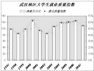 對2007年就業(yè)的2000名應(yīng)屆本科畢業(yè)生進(jìn)行的隨機(jī)問卷調(diào)查顯示,這批工作滿1年的畢業(yè)生就業(yè)滿意率為54.4%,此前就業(yè)滿意率一度從2002年的42%升到2006年的61.9%。