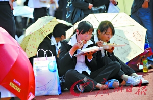也有同學通過“暗號”聯(lián)系,如“某學院經(jīng)管班‘最佳射手’請到主席臺”,估計被呼叫的同學是個足球愛好者。也有同學搞惡作劇。當廣播中有同學尋找周杰倫時,全場一陣笑聲。還有這樣的廣播,“麻省理工大學的××同學請到主席臺,您劍橋的同學在等您”,這在緊張的氣氛中制造了難得的笑聲! ∥/記者 徐靜 圖/記者 邵權(quán)達